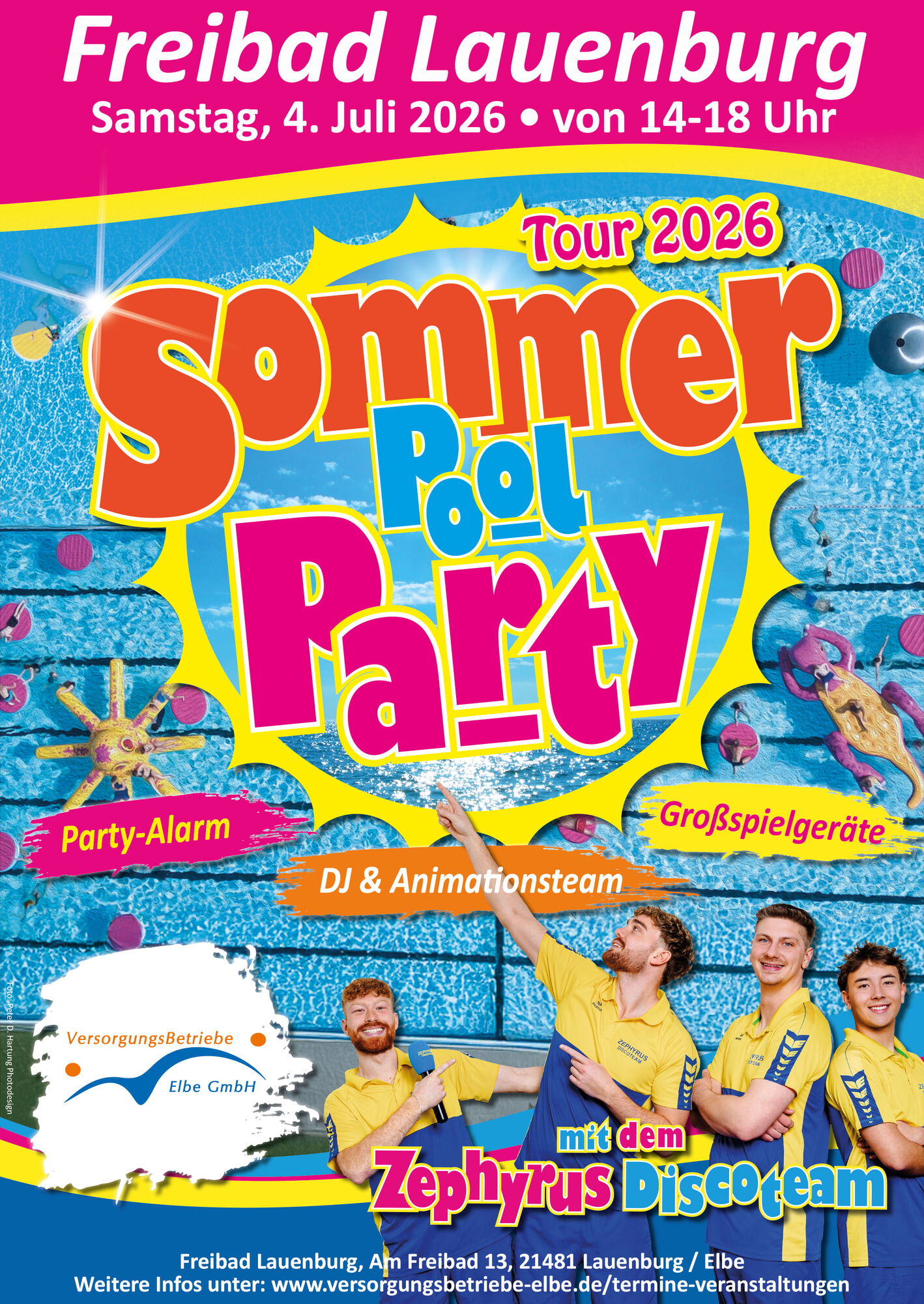 Die Sommerferien werden mit Remmi Demmi am, im und unter Wasser eingeläutet. Zu diesem Anlass wird das Team von Zephyrus anreisen und bietet unseren Badegästen von 14:00 bis 18:00 Uhr ein großes Wasserspektakel, das so richtig Spaß für die ganze Familie bringt. Das Pool-Party-Team No. 1 sorgt für ein einzigartiges Unterhaltungsprogramm, gespickt mit krassen Großspielgeräten, fröhlichen Wettbewerben und viel Musik des Discoteams.